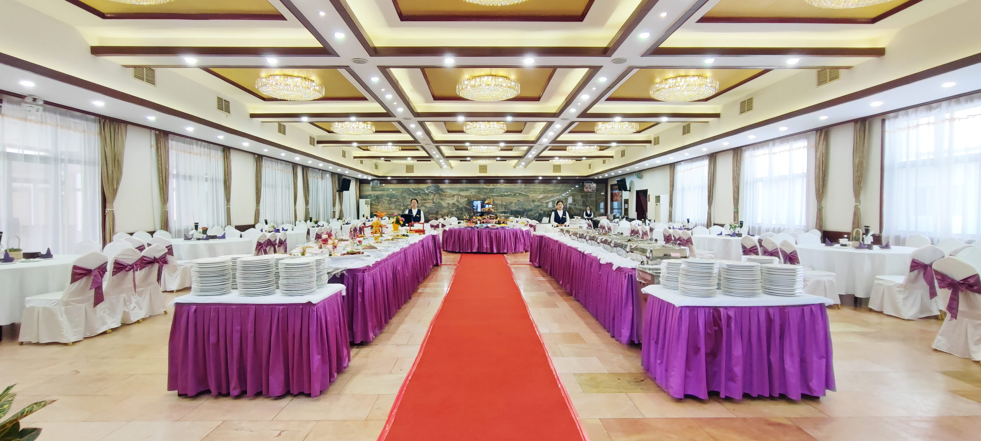 饭店拥有宴会厅、长安厅和具有浓郁西部风土人情小餐厅在内的大小10余个餐厅,可同时容纳近2000人就餐。随时为您提供粤菜、川菜、仿唐宫廷菜、陕菜等精美菜肴。 拥有各类适合会议的自助餐——臊子面、叫花鸡、酱凤爪、香辣鸭头、腊汁肉夹馍、羊肉泡馍、川味串串、烧烤等,让您尽享西北各地特色风味美食。